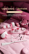 Crafted in a romantic blush palette with gold accents, each piece is adjustable and lined for comfort, ensuring both beauty and safety in every moment. Perfect for couples exploring light restraint or seasoned partners refining their dynamic, this set transforms power play into an art form.