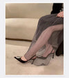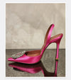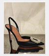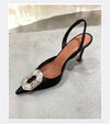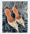 A study in light. Luna’s sharply tapered toe and jewelled buckle catch the eye with an understated sparkle, framing the foot in sleek, sculptural lines. Elegant, effortless, and made for champagne hours.